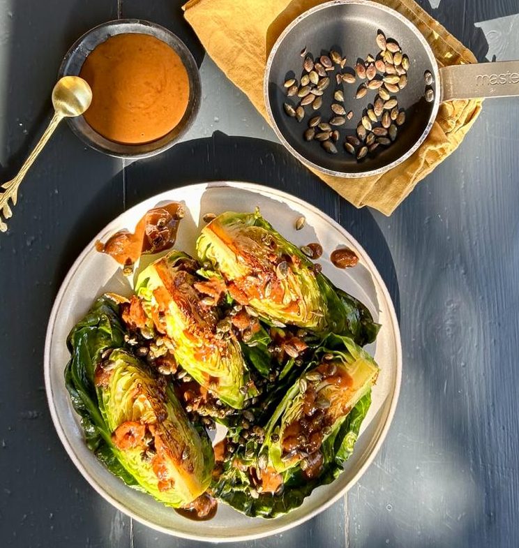 – arrange your cabbage wedges on a plate and drizzle with a little dressing and raisins, followed by some crispy capers and a scattering of toasted pumpkin seeds
