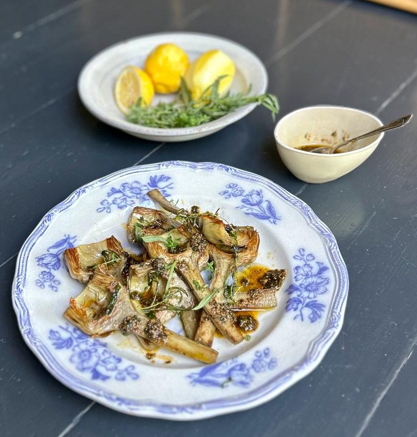 – Arrange the golden charred artichokes and fried herbs on a serving plate and drizzle with some of the reduced pan juices (boil off any excess liquid if necessary) and dot with the chill oil
