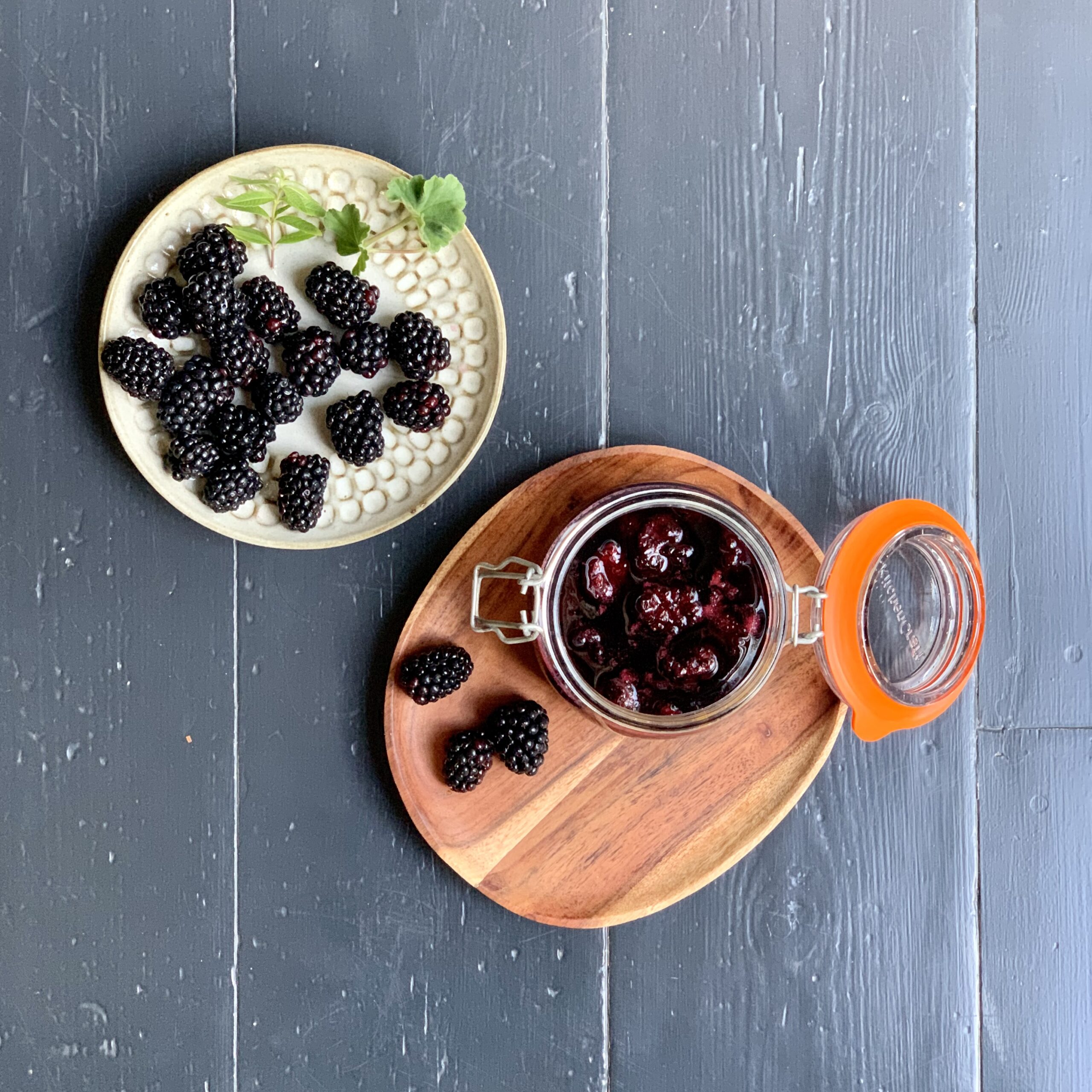 I think it’s probably the change in season and the prospect of cooler climes that’s making me turn my attention to fattier, richer foods.. or perhaps that’s a conveniently timed excuse now that swimming cozis and beach attire have been put away for the year.. either way, all that delicious cheese on my plate needs a sharp little friend to balance it out. These super quick pickled blackberries do just the trick. Made in minutes with a 3:2:1 ratio of fruit to sugar and vinegar, it’s a lovely thing to make your own with other soft berries and flavourings – I’ve used some scented geranium leaves and lemon verbena which work wonderfully together, but, try out other herbs; lemon thyme, bay leaves, lavender and spices; juniper berries, cinnamon sticks…